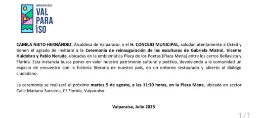 Invitación a ceremonia reinauguración de las esculturas de Gabriela Mistral, Vicente Huidobro y Pablo Neruda